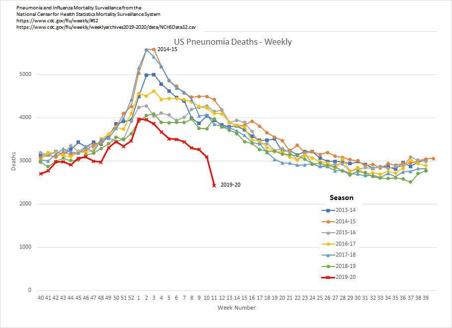 И дали драстичното намалување на статистиката за смртност од пневмонија е резултат на нејзино вештачко статистичко прешалтување во Ковид-19 за прикривање на лагата околу вирусот на смртност, коментира широко распространетата објава на reddit врзувајќи се со дијаграмот објавен од државната статистика на САД кој тоа и го потврдува (видете ја црвената стрмно надолна линија на смрт од пневмонија во март во споредба со истиот месец во претходните години):