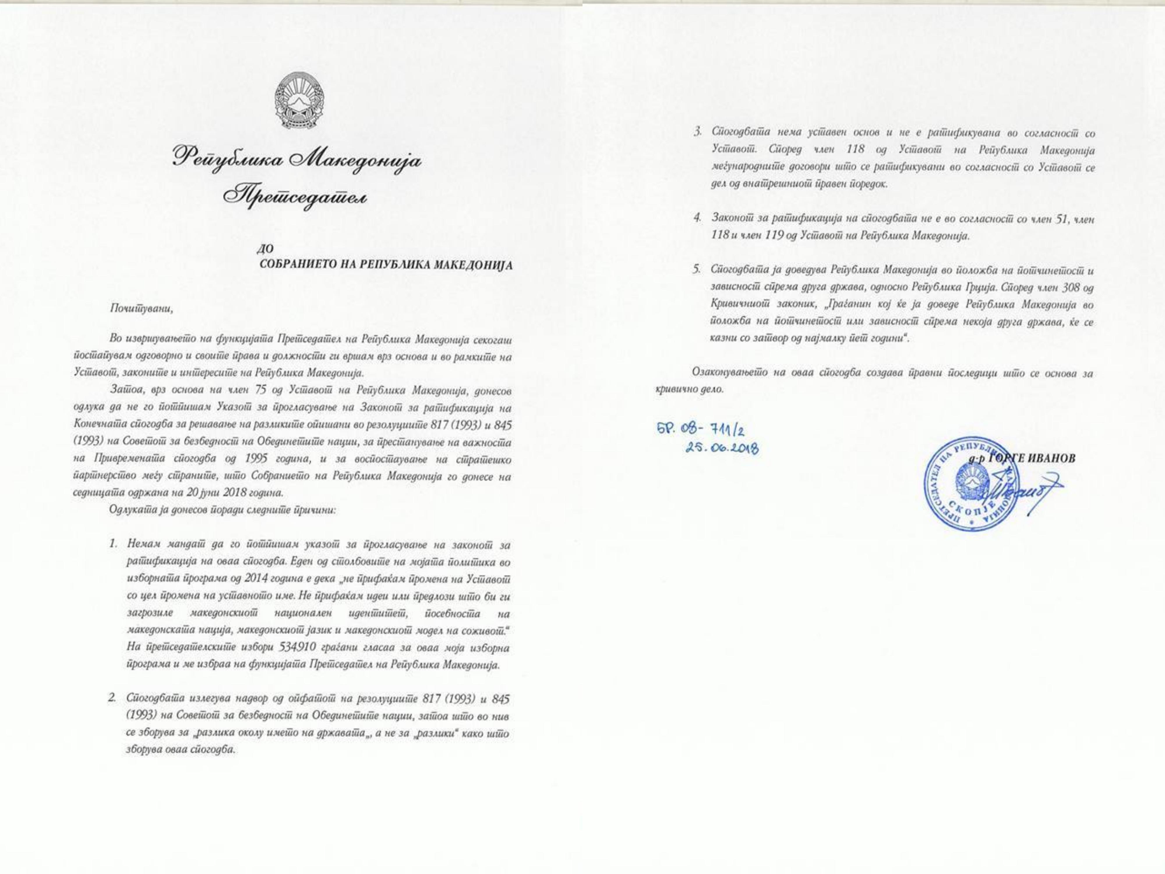 Затоа, врз основа на член 75 од Уставот на Република Македонија, донесов одлука да не го потпишам Указот за прогласување на Законот за ратификација на Конечната спогодба за решавање на разликите опишани во резолуциите 817 (1993) и 845 (1993) на Советот за безбедност на Обединетите нации, за престанување на важноста на Привремената спогодба од 1995 година, и за воспоставување на стратешко партнерство меѓу страните, што Собранието на Република Македонија го донесе на седницата одржана на 20 јуни 2018 година.