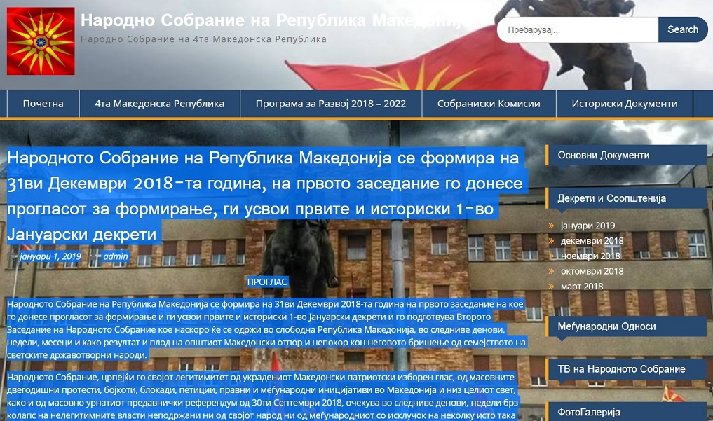 Народното Собрание на Република Македонија со овој декрет ги информира сите меѓународни фактори, организации, асоцијации и сите држави членки на ООН дека од 1ви Јануари 2019 година ја превзема законодавната и извршна власт во Република Македонија од нелегитимните  нелегитимните и однадвор назначени марионетски и окупаторски Влада и Собрание и ја враќа назад на народот до следните демократски избори во рок од 6 месеци.