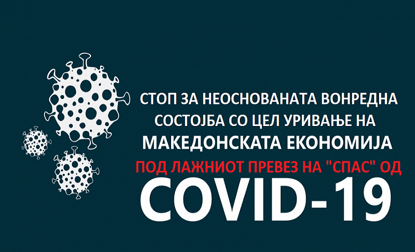 Затоа, поради немање факти за објаснување и поради незаконитоста на воведување вонредна состојба за да се бориш со вирус кој по сите светски здравствени статистики е во рангот на сезонски грип, бараме итно укинување на безумната одлука, итна оставка и кривична одговорност за уривањето на Македонскиот производител и претприемач, и формирање на Експертска Влада која ќе се справува со последиците од вашето безумие и ќе организира фер и демократски избори, кои вие не сте во состојба да ги организирате.