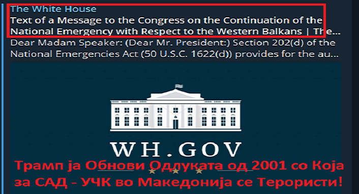 Незабележано во нашите продадени корумпирани медиуми со цврсто затнати муцки со рака колнети Соросови долари помина веста дека Претседателот Трамп ја продолжи вонредната состојба за Западен Балкан и Република Македонија, со која на УЧК им беа скршени терористичките крила и со која сега повторно се влечат Хашимовци и други Косовски УЧКи пред Меѓународниот Суд за Воени Злосторства во Хаг а за воени злосторства и тероризам а скоро ќе им се приклучат и Амети, Груби, Османи и слични воени злосторници против Македонскиот Народ!