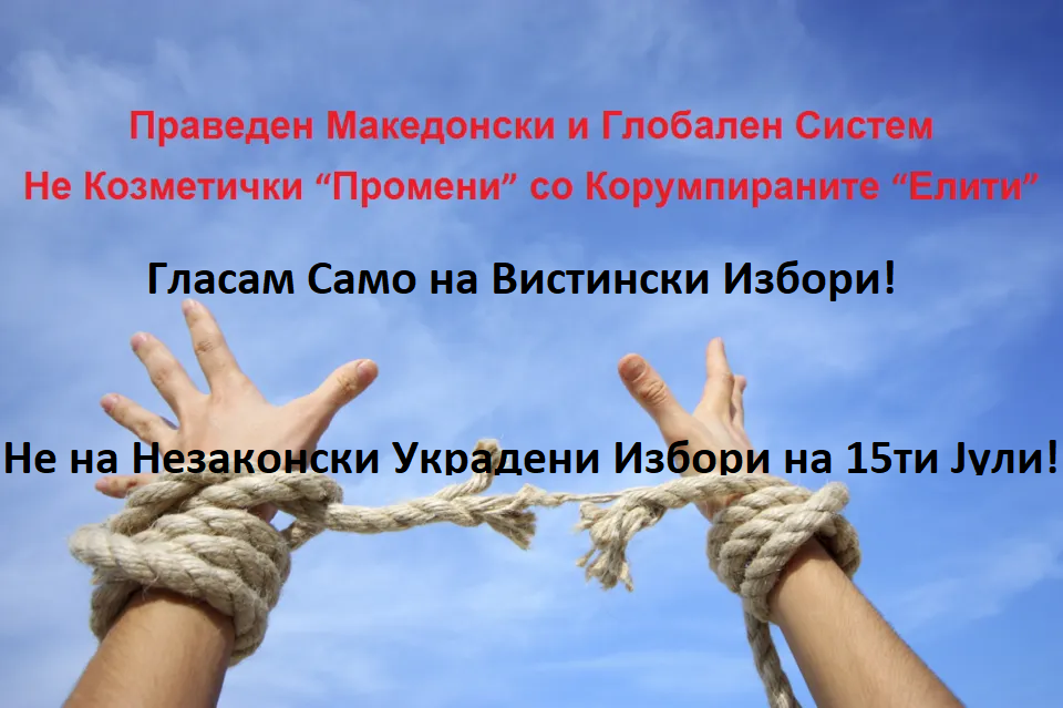 На кои избори ќе излеземе браќа и сестри? На избори без избор? На избори наместени и поткупени? На избрзани од некоја причина избори? На избори кои според сите прописи во оваа држава (ако остана некој пропис непогазен), се НЕЛЕГАЛНИ, НЕЛЕГИТИМНИ И АНТИУСТАВНИ?