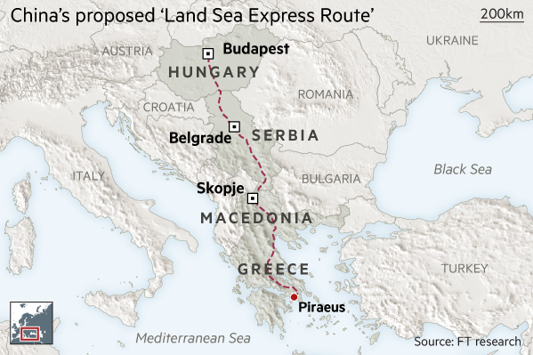 Кина ќе гради железничка мрежа на брзи возови од Будимпешта до грчкото пристаниште Пиреј преку Белград и Скопје. Kинескиот гигант “Коско” го финализираше договорот за купување контролен пакет во грчкото пристаниште Пиреj, најголемото во земјата. Кинезите веќе инвестираа околу 600 милиони евра за модернизација на објектот, претворајќи ја во една од првите 50 пристаништа во светот во поглед на обемот на контејнери. На состанокот на крајот од 2016 помеѓу Кина и земјите од Централна и Источна Европа (формат Кина-ЦИЕ) во Суджоу, Пекинг официјално се обврза заложи за проектот од Будимпешта до Белград. И ова е само почетокот, Кина сака да го петвори Пиреј во европски јазол за кинеските бродови што доставуваат производи во Европа. Тие сега патуваат низ Суецкиот канал пред да заминат во некое северно пристаниште, како што се Ротердам или Хамбург. Релативната близина на Пиреј го прави поатрактивна опција – кога на Балканот ќе се обезбедат современи патишта и пруги по кои може да се врши брз и современ транспорт на товар.