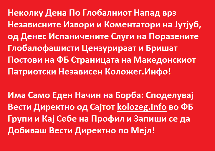 СПОДЕЛУВАЈТЕ ДИРЕКТНО ОД kolozeg.info на ФБ, Твитер итн! Само Неколку Дена По Глобалниот Напад врз Независните Извори на Јутјуб, од Денес Испаничените Слуги на Поразените Глобалофашисти Цензурираат и Бришат Постови на ФБ Страницата на Патриотскиот Независен Коложег.Инфо! Почна Инквизициското “Горење нa Книги” на Јутјуб од Страна на Глобалофашистите! Следи и ФБ, Твитер!