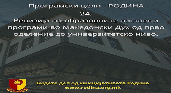 Точка 24 од Програмските цели на Родина: Ревизија на образовните наставни програми во Македонски Дух од прво оделение до универзитетско ниво.