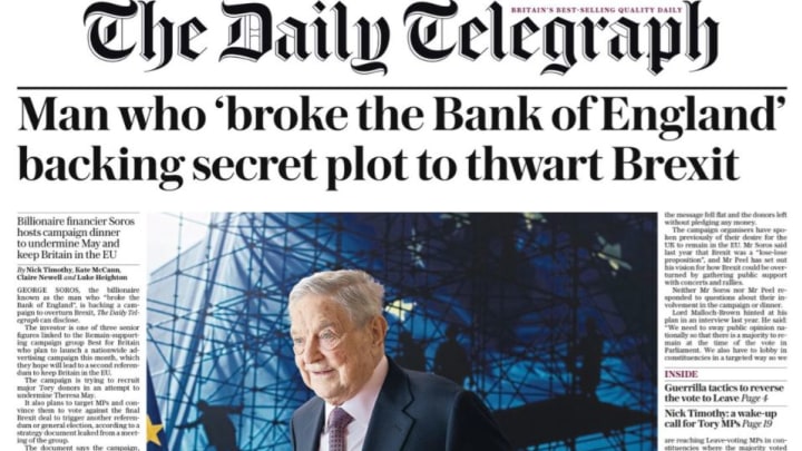 Финансирањето на анти-Брексит кампањи од унгарскиот евреин и милијардер и осудениот за инсајдерски тргувања е прашање кое е многупати потврдено, како на пример во извештаите од 2018 година кои ги наведуваат донациите на Сорос на само една од групите во Останување во ЕУ – многу групирани заедно во глобалистичкото гнездо, лондонскиот Millbank Tower – со сума од 5 милиони фунти .