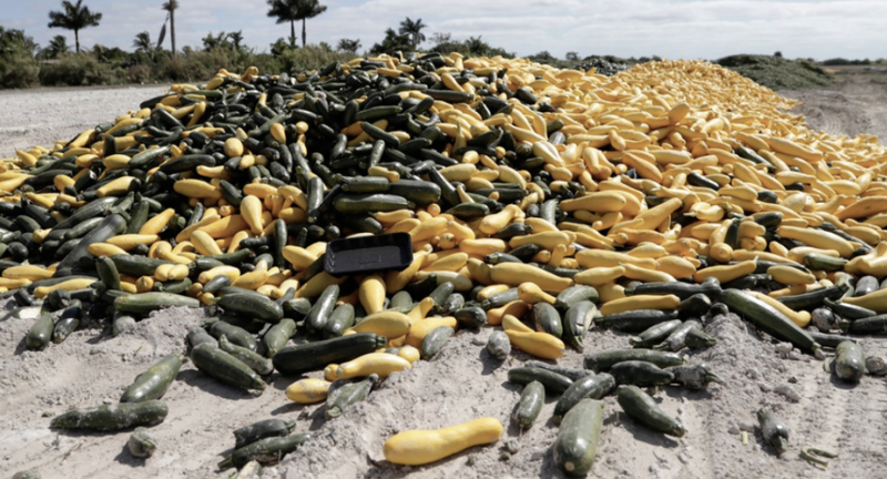 АП ја започна својата приказна во Палмето, Флај, во Флорида, каде што земјоделец фрли тони тиквички и друг свеж зеленчук за да изгние.