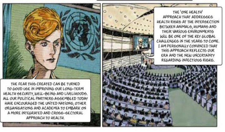 Дали сето ова беше одамна испланирано и организирано однапред за глобалофашистите преку фабрикувана хистерија и лажен страв да ве натераат сами да трчате кај нив за “спас” и со тоа доброволно без отпор да си ја наметнете ропската јамка околу вратот? Авторот Стив Вотсон преку Самит Њуз, пишува за чудниот стрип, нарачан за објавување од страна на Европската унија во 2012 год, кој до детал го “предвиде” (читај го откри планот на глобалистите) сето она што се одвива сега со глобалната пандемија „Ковид-19“. Како и да е, во оваа ефтина пропаганда, и ваше потсвесно програмирање и омекнување, неизбрани глобалистички бирократи ја “спасуваат” планетата со воведување на единствен здравствен систем и глобално зомбирање на луѓето со чипирани штетни вакцини. Значи во сопствената фикција и влажни соништа на Еврократите, глобализмот ја спасува планетата. Во реалноста, таа завршува во масовна смрт, затворање на економиите, домашен затвор, ропство и глобална тиранија.
