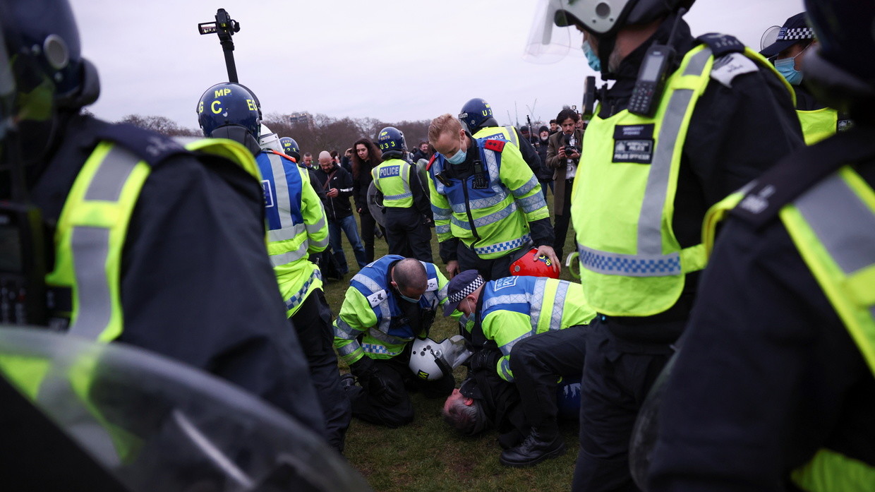 Пирс Корбин, 73-годишниот брат на поранешниот лидер на лабуристите Џереми Корбин и гласен критичар за заклучување и вакцини, одржа жесток говор во Хајд Парк пред полицијата да го растури собирот и демонстрантите да продолжат да маршираат низ улиците на Лондон.