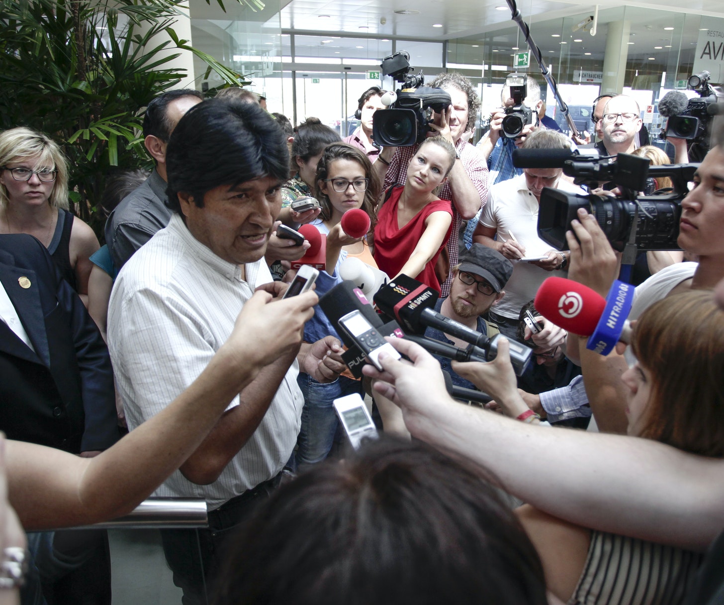 Боливискиот претседател Ево Моралес одржа прес-конференција на Меѓународниот аеродром во Виена на 3 јули 2013 година, налутено реагирајќи откако неговиот авион беше пренасочен кон Виена поради сомневање дека во авионот бил бегалецот и американски разузнавач Едвард Сноуден.